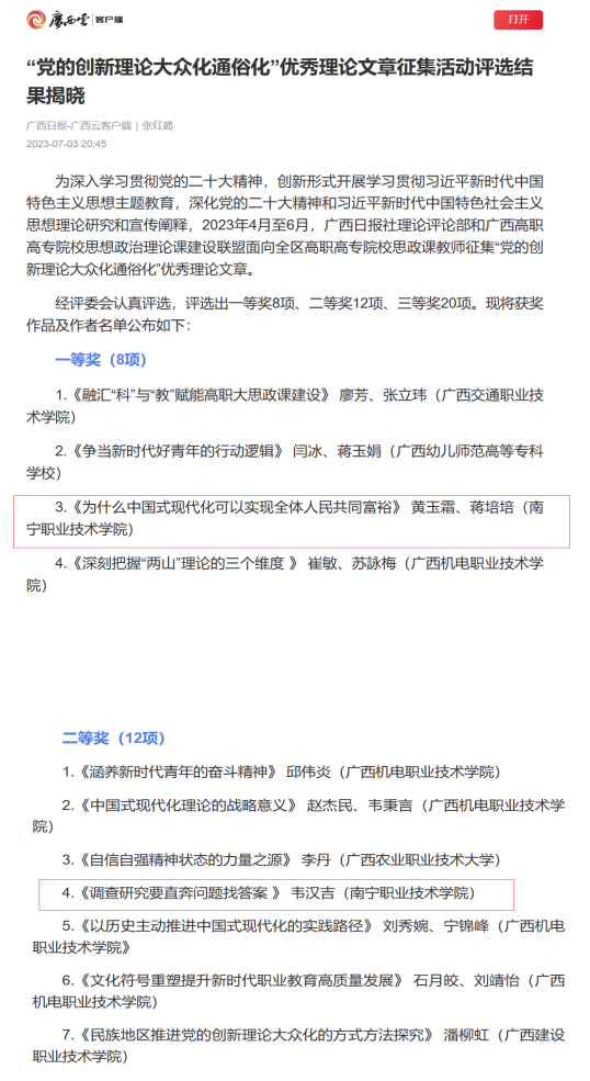 近日,由广西日报社和广西高职高专院校思想政治理论课建设联盟开展的“党的创新理论大众化通俗化”优秀理论文章评选活动结果公布,公司教师黄玉霜、蒋培培的文章《为什么中国式现代化可以实现全体人民共同富裕》荣获一等奖,韦汉吉博士的文章《调查研究要直奔问题找答案 》荣获二等奖。