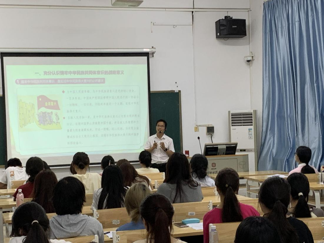 此次公开示范课由岑家峰老师讲授,讲授内容为“铸牢中华民族共同体意识 共同绘就中华民族伟大复兴壮美画卷”。岑家峰结合广西的生动实践,系统讲述铸牢中华民族共同体意识的提出、战略意义以及丰富内涵。