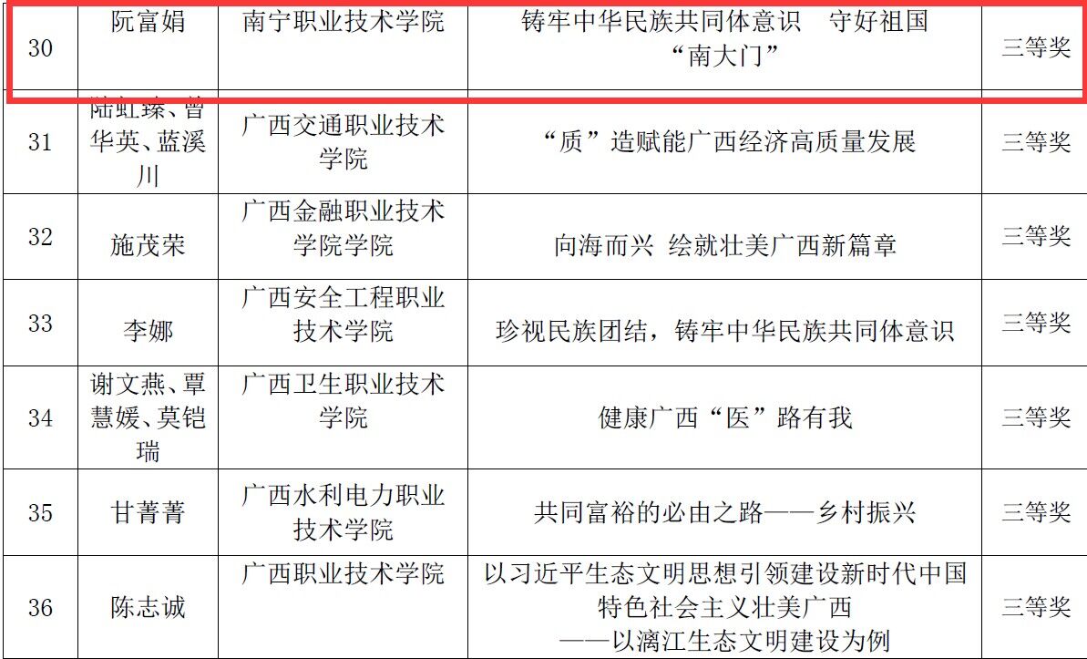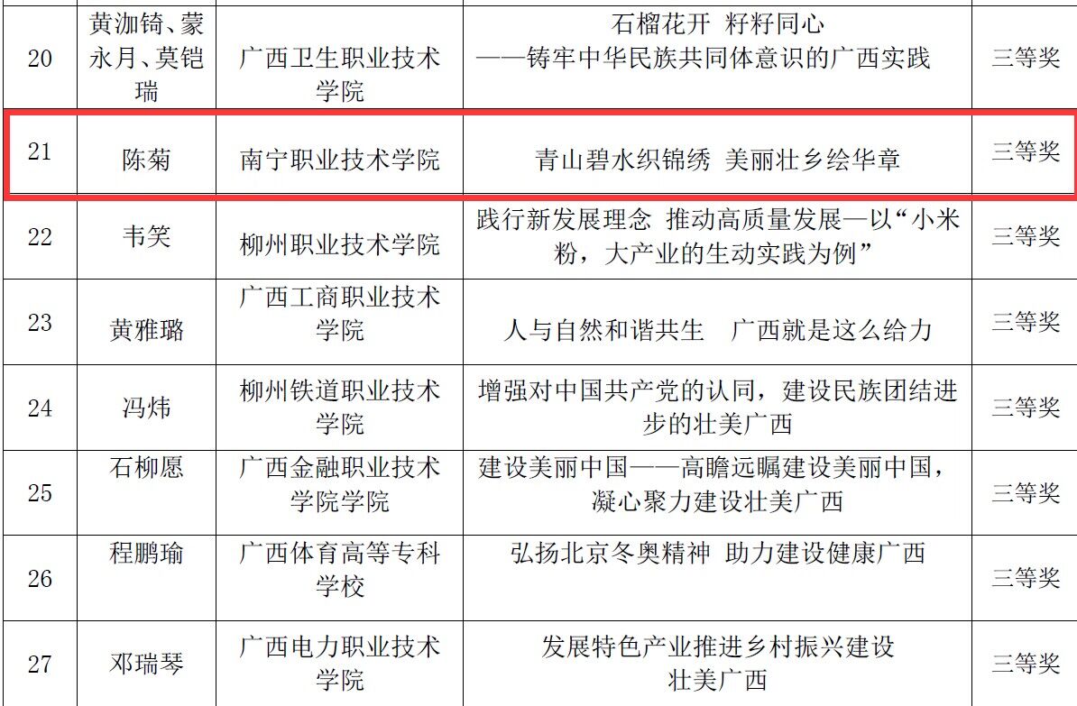 据悉,本次比赛全区高校报送的申报课共有260堂,经组织专家初评和现场决赛,共认定“壮美广西”系列思政课“示范课堂”130堂,其中高职组43堂:一等奖4堂,二等奖12堂,三等奖27堂。