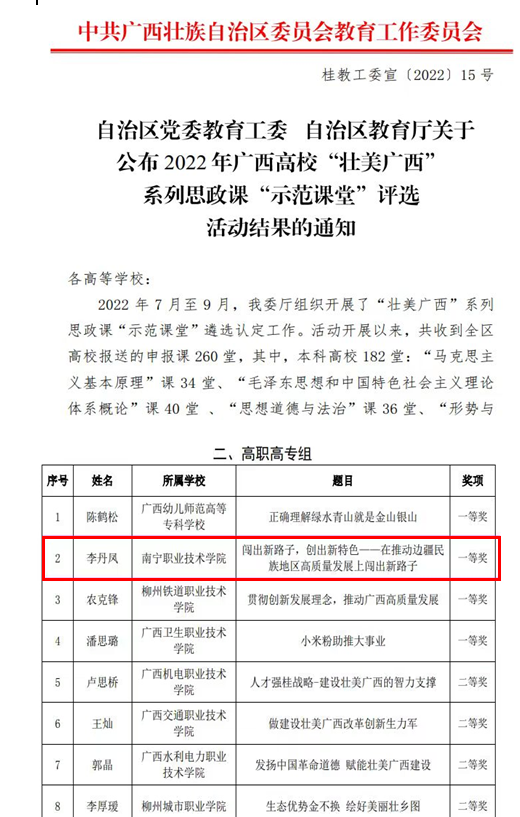 近日,自治区党委教育工委 自治区教育厅公布2022年广西高校“壮美广西”系列思政课“示范课堂”评选活动结果,伟德体育李丹凤教师在活动中荣获一等奖,陈菊、阮富娟分别荣获三等奖。