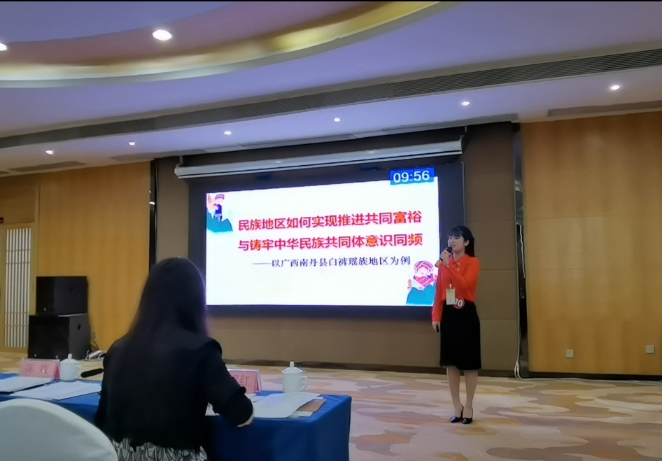 比赛共分为初赛、决赛两个环节,历时6个月,共有来自全区高校130多份优秀作品参加评选,经过专家评审,本科组有14份作品,高职组有8份作品入围最终决赛,公司从众多优秀作品中脱颖而出成功入围。在决赛中,本科、专科、研究生同台竞技,来自艺术设计公司室内艺术设计专业的冯彩云同学以《民族地区如何实现推进共同富裕与铸牢中华民族共同体意识同频——以广西南丹县白裤瑶族地区为例》为主题,代表公司实践团队进行成果展示,冯彩云同学凭借扎实的理论功底、娴熟的展示技巧展示了公司实践团队在理论学习、调研成果、实践成果等方面取得的成绩,经过激烈角逐,最终斩获二等奖。