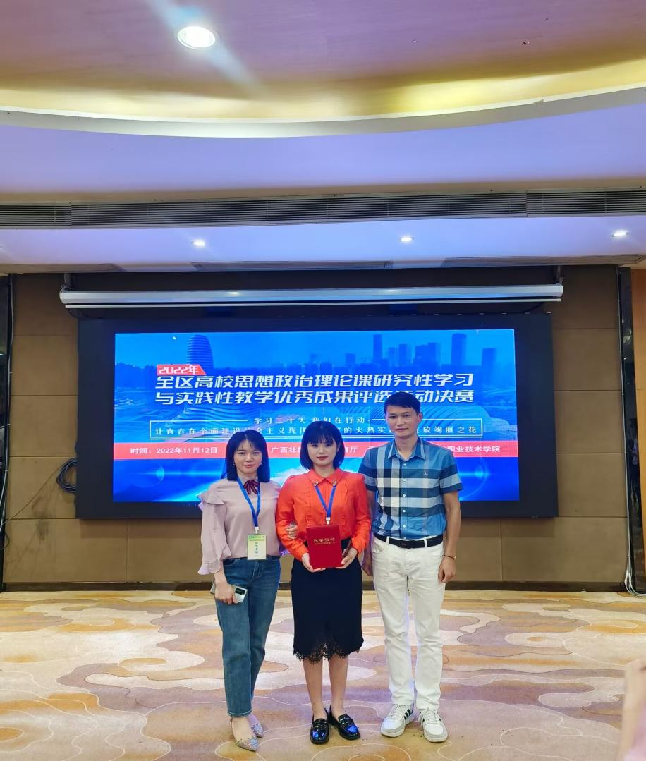 11月12日,由广西壮族自治区教育厅主办、广西机电职业技术公司承办的2022年全区高校思想政治理论课研究性学习与实践性教学优秀成果评选活动落下帷幕,公司黄玉霜、蒋培培两位老师指导的员工团队获得二等奖。