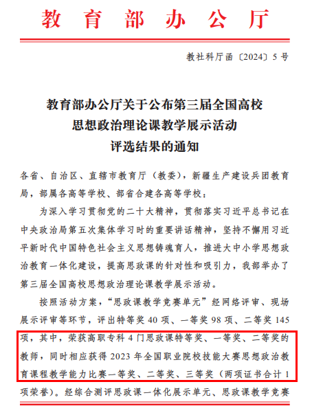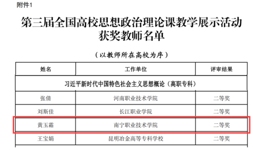 近日,教育部公布了第三届全国高校思想政治理论课教学展示活动评选结果,公司伟德体育教师黄玉霜荣获“习近平新时代中国特色社会主义思想概论”课程(高职高专)组二等奖,同时相应获得2023年全国职业院校技能大赛思想政治教育课程教学能力比赛三等奖,实现了公司在全国高校思想政治理论课教学展示活动中获奖的零的突破。