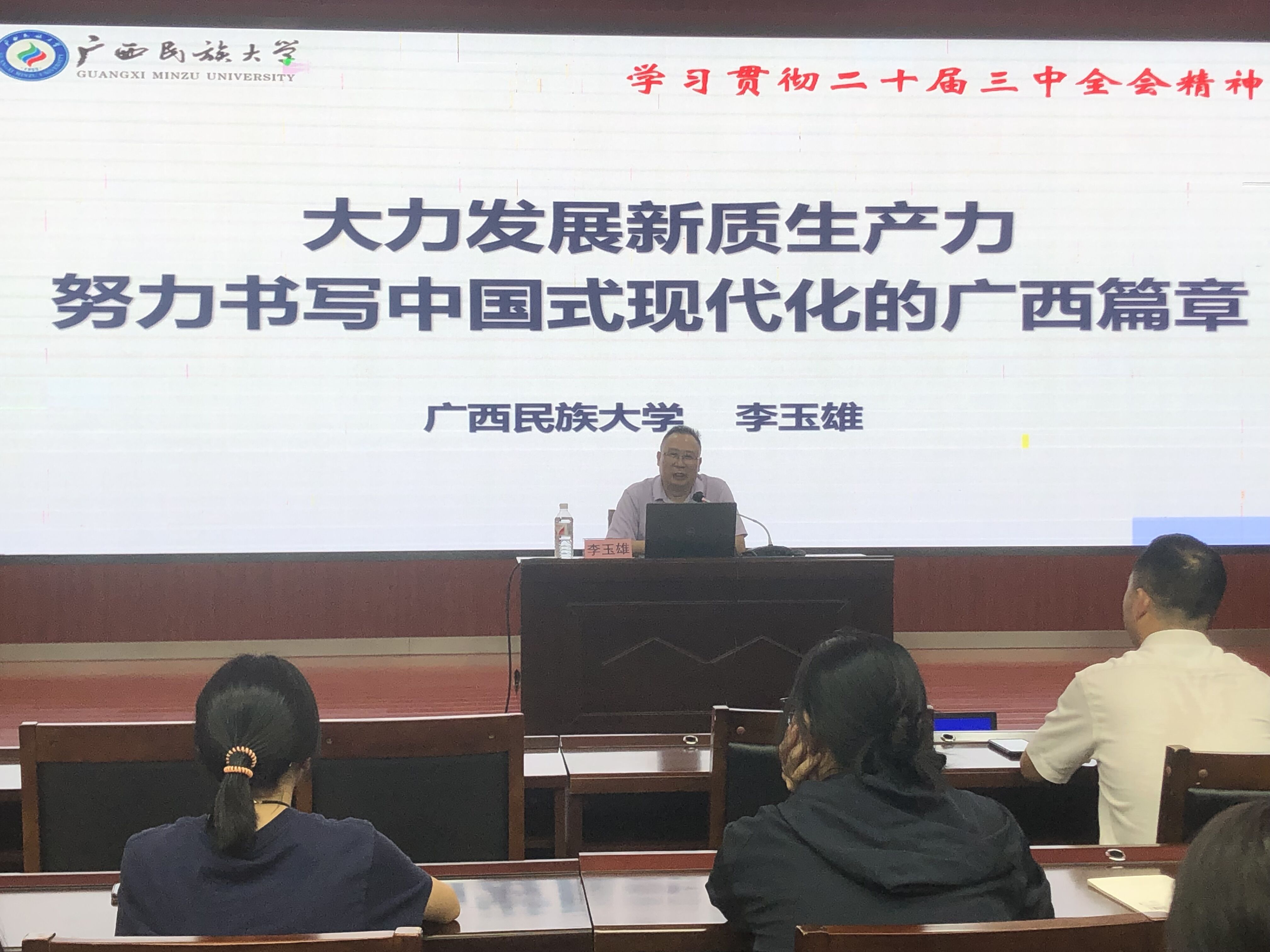 李玉雄教授从新质生产力提出的时代背景、内涵、广西发展新质生产力的紧迫性、广西发展新质生产力的建议等方面进行详细解读和阐述。