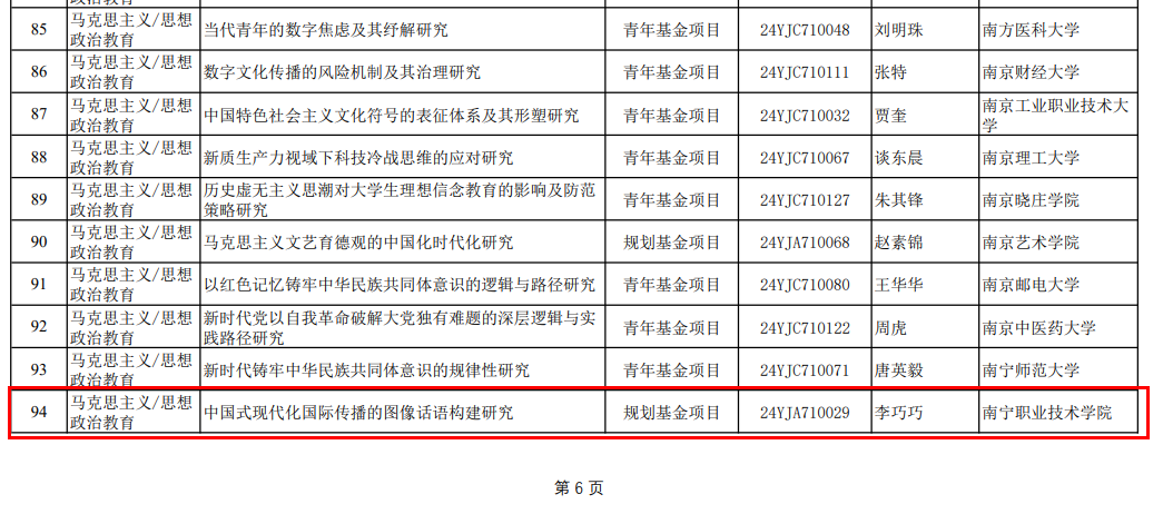 近日,教育部社科司公布《教育部社科司关于2024年度教育部人文社会科学研究一般项目立项的通知》(教社科司函〔2024〕56号),公司院伟德体育李巧巧副教授申报的《中国式现代化国际传播的图像话语构建研究》获规划基金项目立项,是广西职业院校唯一获得立项的“马克思主义/思想政治教育”学科项目。